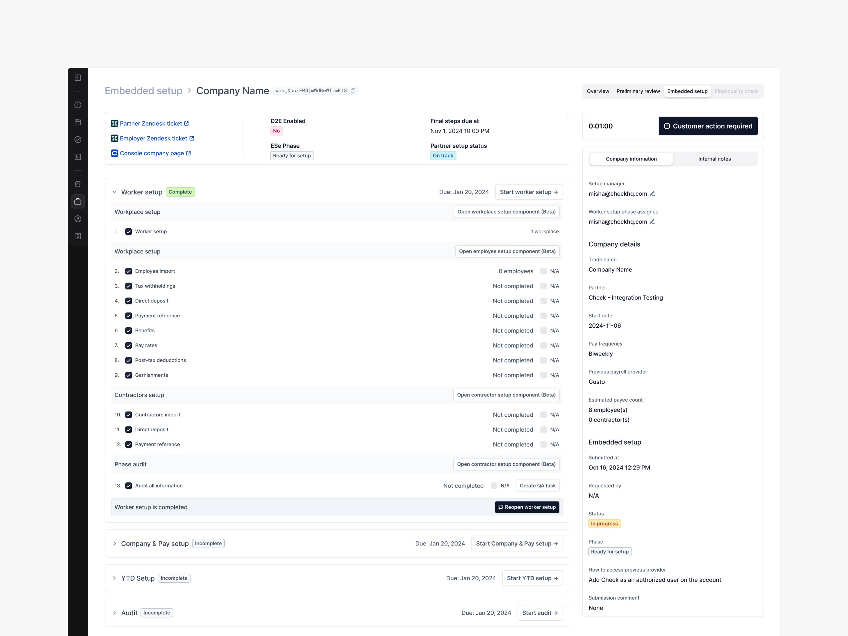 Admin is the tool Check’s internal teams use to onboard and configure new client companies. It’s a technical, high-stakes environment with lots of steps and dependencies.